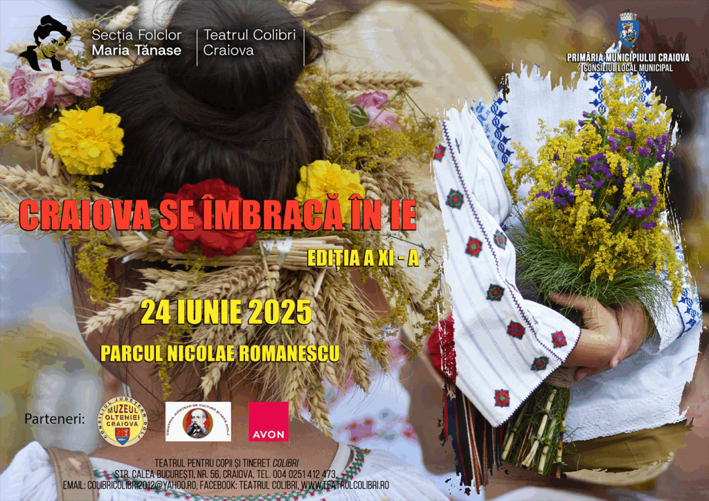 Teatrul pentru copii și tineret Colibri, secția Folclor „Maria Tănase“ organizează cea de-a XI-a ediție a manifestării „Craiova îmbrăcată în ie”, marți, 24 iunie, omagind Sânzienele și Ziua Universală a Iei.