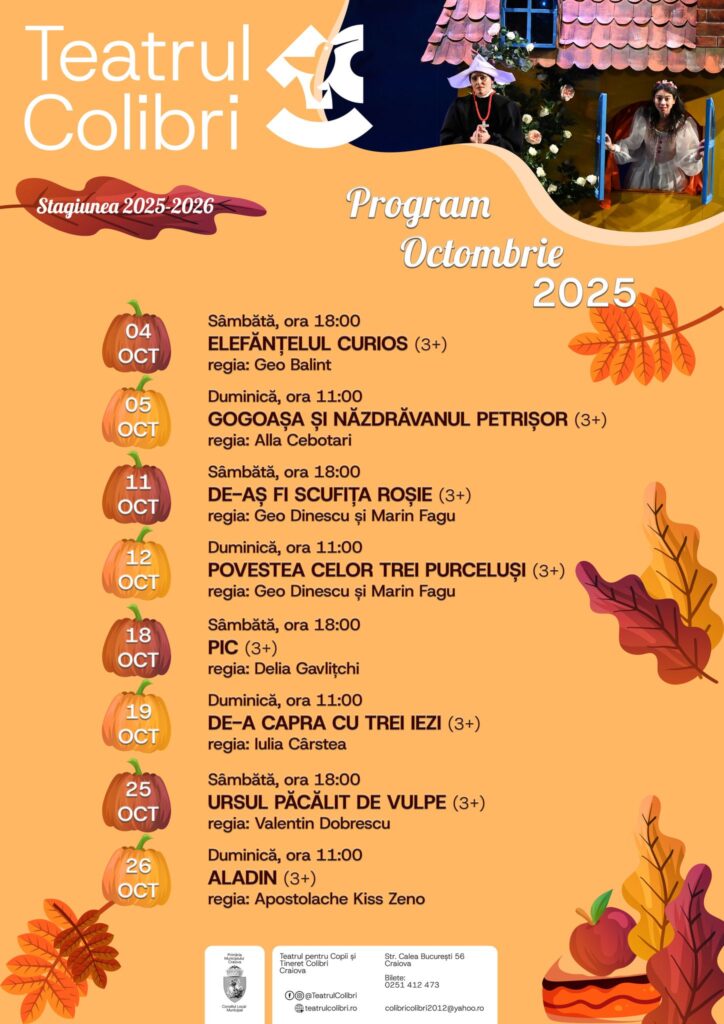 Teatrul pentru Copii și Tineret Colibri Craiova – Secția de Teatru invită publicul la un weekend plin de bucurie și povești captivante. Actorii implicați sunt: Oana Stancu, Emanuel Popescu, Daniel Mirea, Adriana Ioncu, Robert Iovan, Marin Fagu, Ionica Dobrescu, Alla Cebotari și Alis Ianoș.