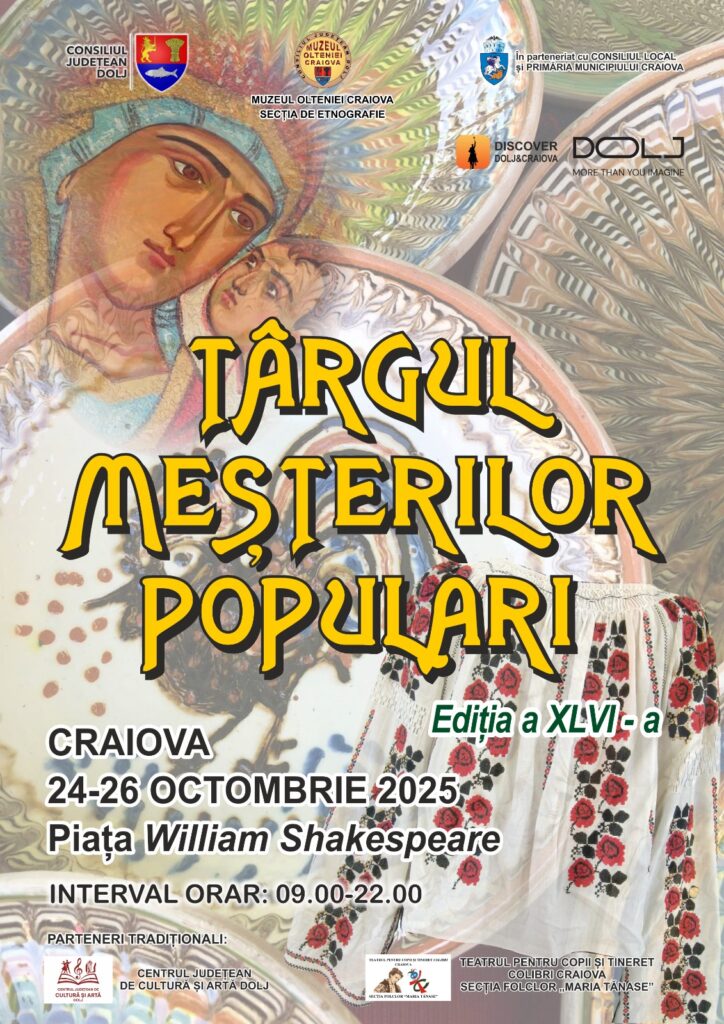 Între 24 și 26 octombrie, în Piața „William Shakespeare” din Craiova, are loc cea de-a 46-a ediție a Târgului Meșterilor Populari.