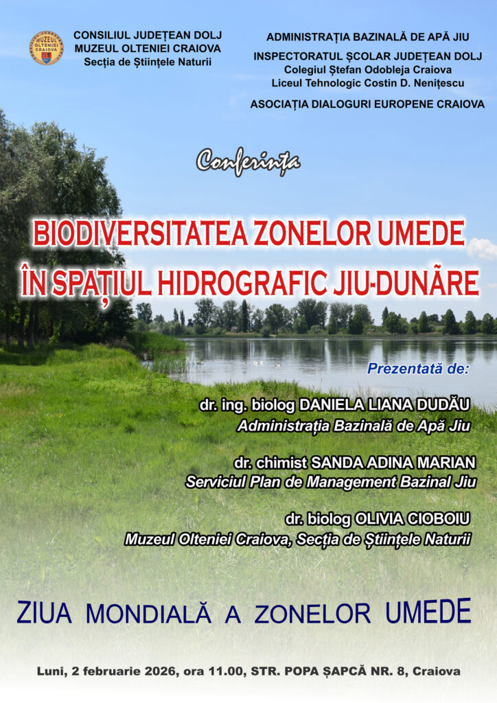 Elevi, cadre didactice și specialiști în ecologie și hidrobiologie se reunesc luni, 2 februarie, la Muzeul Olteniei Craiova, pentru o sesiune interactivă despre importanța ariilor umede, conservarea biodiversității și gestionarea ecosistemelor acvatice din sectorul inferior al Jiului și al Dunării.