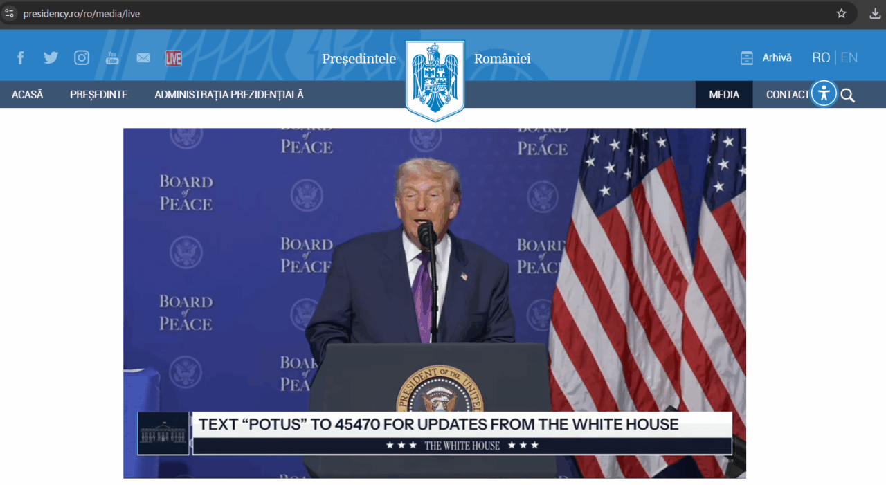 Președintele României, Nicușor Dan, a participat la Consiliul de Pace de la Washington, eveniment al cărui discurs a fost pregătit de consilierii săi până într-acolo încât au uitat importanța traducerii. Transmisiunea în direct a evenimentului a fost disponibilă doar pentru vorbitorii de limbă engleză, iar discursurile celorlalți participanți n-au fost interpretate pentru publicul român sau pentru ceilalți invitați. Evenimentul a fost aproape inaccesibil pentru cei care nu vorbesc limba engleză, fiind difuzat în exclusivitate în această limbă, într-o situație considerată neobișnuită pentru o participare de nivel oficial a unui șef de stat român.