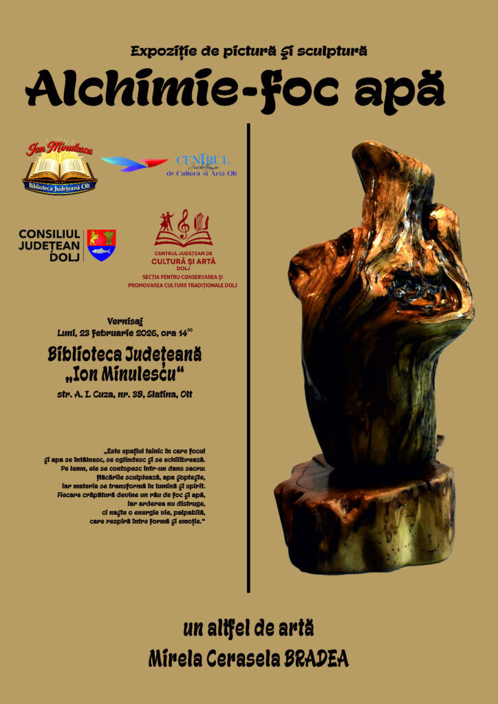 Luni, 23 februarie, Biblioteca Județeană Olt „Ion Minulescu” a găzduit vernisajul expoziției „Alchimie – foc apă”, semnată de artista Mirela Cerasela Bradea. Evenimentul a avut loc la ora 14:00 și a fost organizat de Centrul Județean de Cultură și Artă Dolj, Secția pentru Conservarea și Promovarea Culturii Tradiționale Dolj, fiind sprijinit de Centrul Județean de Cultură și Artă Olt. Expoziția va putea fi vizitată până pe 10 martie 2026.