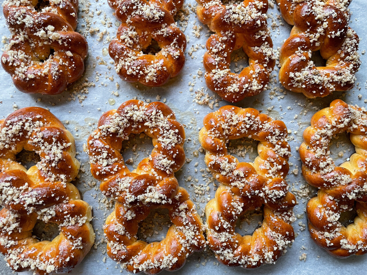 După dospire, aluatul se împarte în bucăți egale și se modelează în forma de „8”. Acestea se ung cu ou, se lasă să odihnească încă 25 de minute, apoi se coc timp de 30 de minute în cuptorul preîncălzit la 160 de grade Celsius, până devin aurii și își măresc volumul.