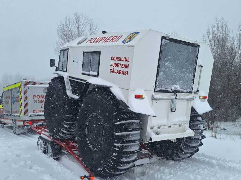 ISU Călărași a utilizat un utilaj rar întâlnit pe drumurile din România pentru intervenții în condiții de vreme severă, un vehicul special de tip SHERP, surprins în acțiune pe rețelele de socializare. Vehiculul a fost folosit pentru a trece peste stratul de zăpadă de pe marginea carosabilului, între Lehiu Gară și Valea Argovei.