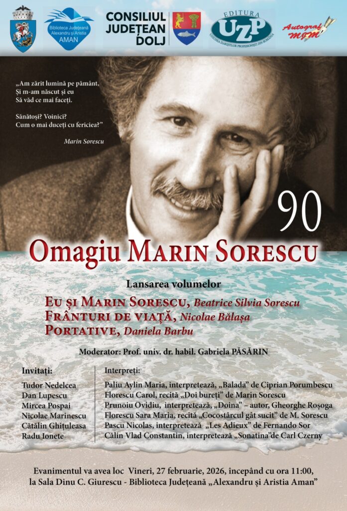 Biblioteca Județeană „Alexandru și Aristia Aman” organizează vineri, 27 februarie, un eveniment dedicat scriitorului Marin Sorescu, cu ocazia împlinirii a 90 de ani de la nașterea sa. Manifestarea va începe la ora 11:00 în sala „Acad. Dinu C. Giurescu”.