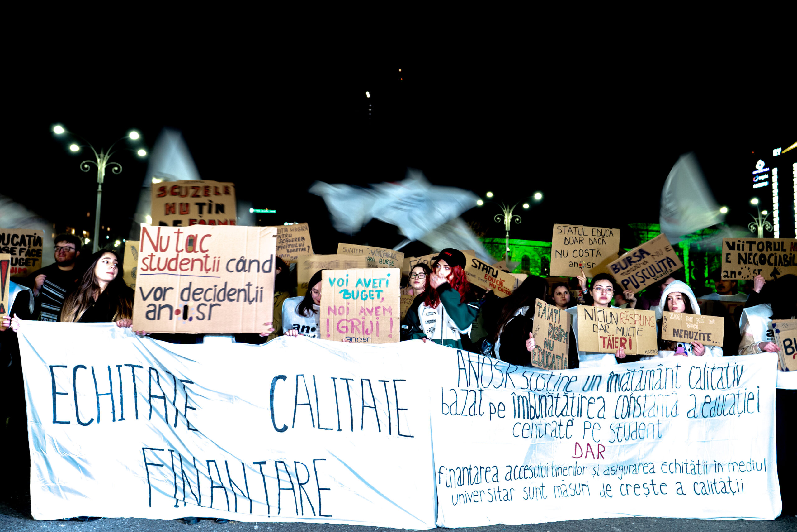 Studenții din mai multe centre universitare din România au protestat sâmbătă seară în fața universităților și în Piața Victoriei din București, nemulțumiți de reducerea burselor și de diminuarea unor drepturi, printre care și cele legate de transport. Ministerul Educației a trimis un oficial pentru a discuta cu protestatarii, asumându-și angajamentul pentru majorarea bugetului destinat burselor și promovarea unei schimbări de mentalitate în rândul studenților.